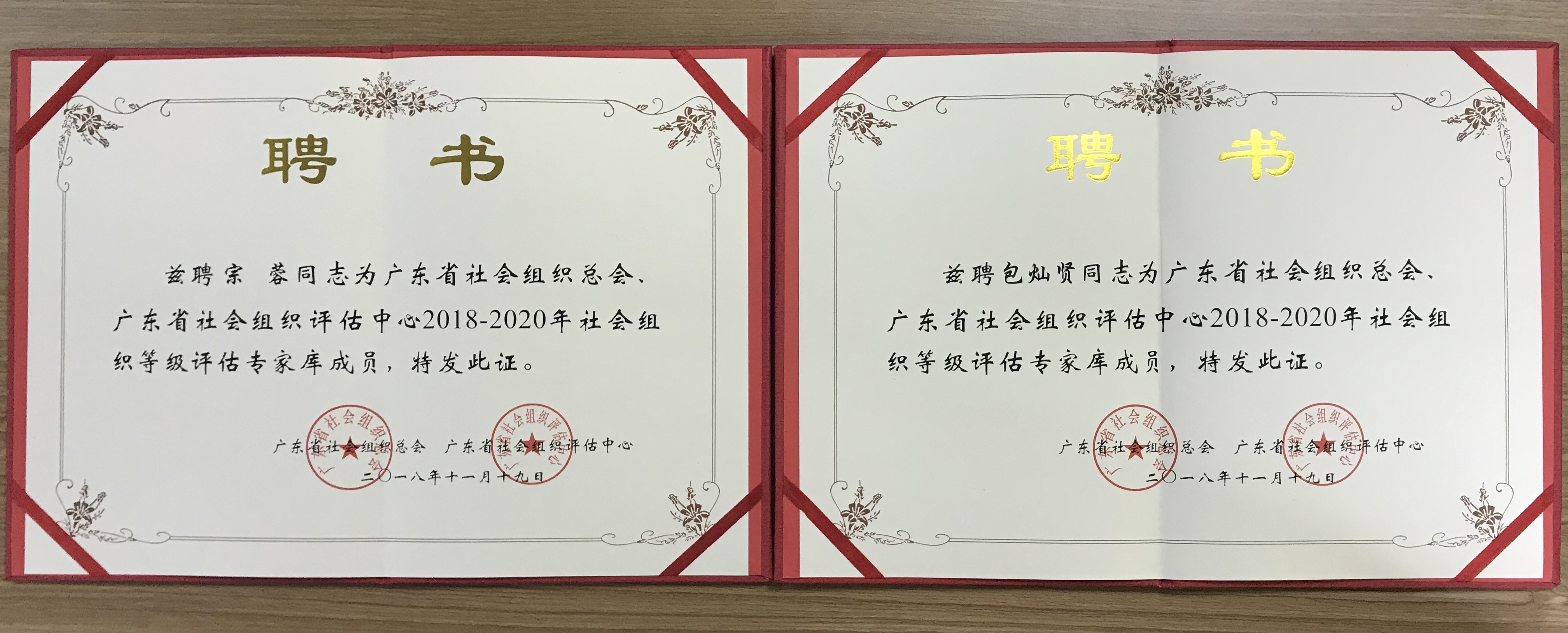 经过严格筛选与考核,2018年11月19日,广东省社会组织总会、广东省社会组织评估中心聘请广东省南粤公益基金会宗蓉理事长、包灿贤副秘书长为2018~2020年社会组织等级评估专家库成员,这是广东省南粤公益基金会坚守初心、锐意奋进的阶段性成果,是贯彻落实十九大精神,科学发展基金会与公益事业的必然性成绩。