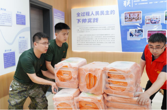 物资卸载点迅速成为一线“战场”,军民同心、众志成城。迷彩身影穿梭其间,物资接力有序高效,每一双手都传递着爱心与希望。沉重的物资在臂膀间迅速流转,汗水浸透衣衫,背影愈发坚定。那湿透的衣角,正是南粤军旭志愿服务队践行使命、无私奉献的最好印记,映照出他们不畏艰险、守望相助的赤诚之心。